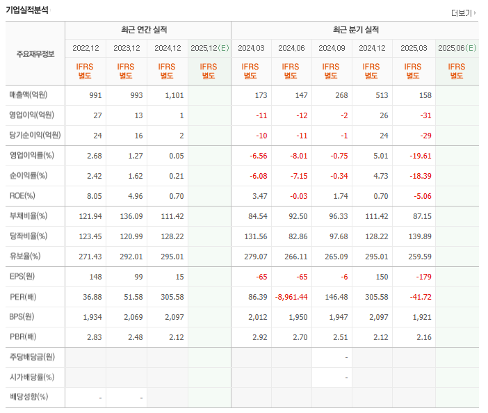 -▪PER : 3.39배 ▪PBR : N/A ▪EPS : -100원 ▪외인소진율 : 1.21%